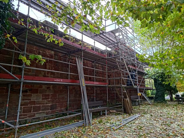 Nachdem die Sandsteinfassade des südlichen Querhauses beendet ist, beginnen wir nun mit der Sanierung des Kreuzgangs.